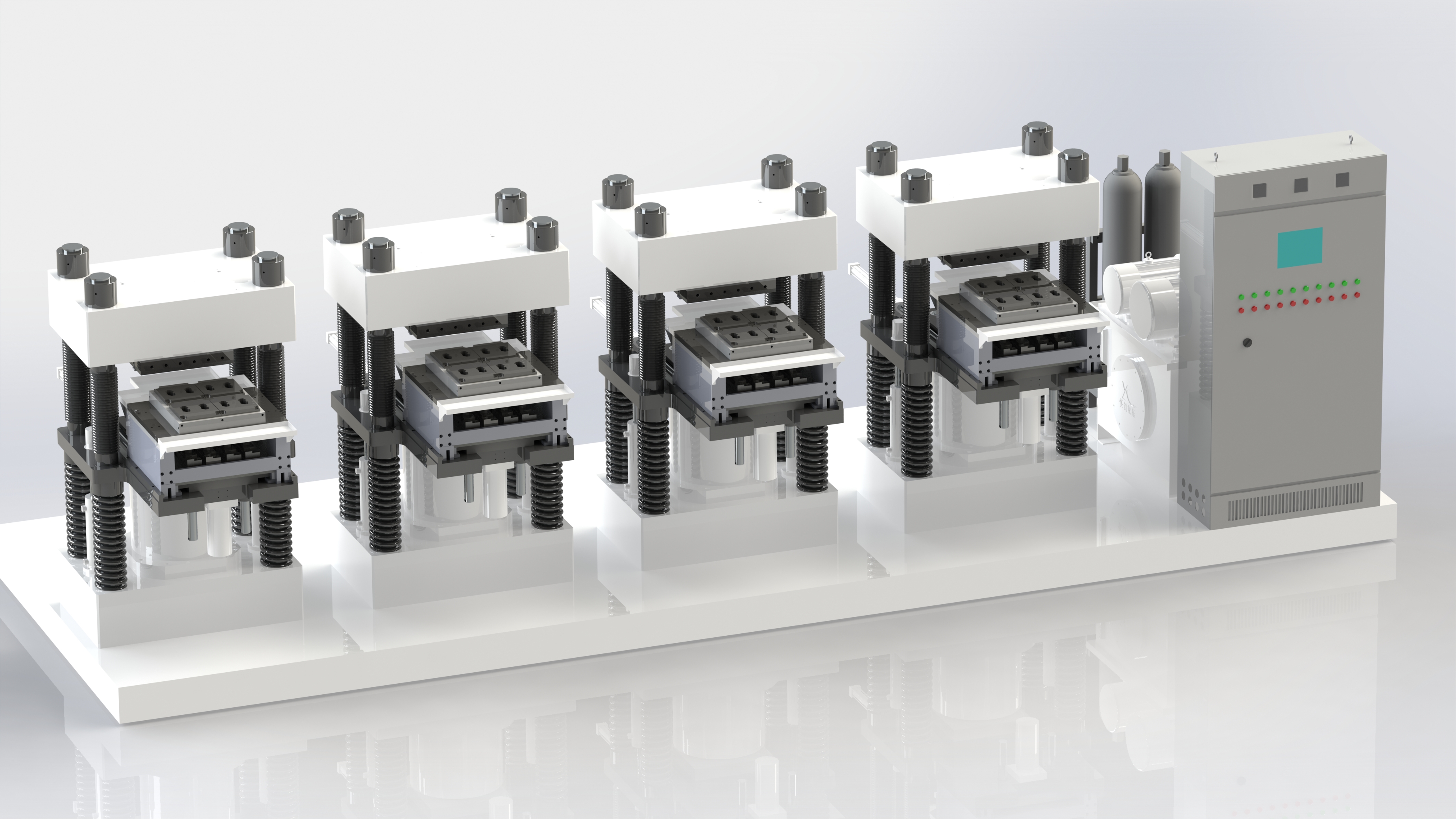 加热控制: 模具加热系统单工位单独控制,换模不用更换加热,模腔有效压制范围内温度精确控制在±4°,模具采用模块化设计,结构紧凑,预热时间小于30分钟,并且很容易进行模具的更换;。